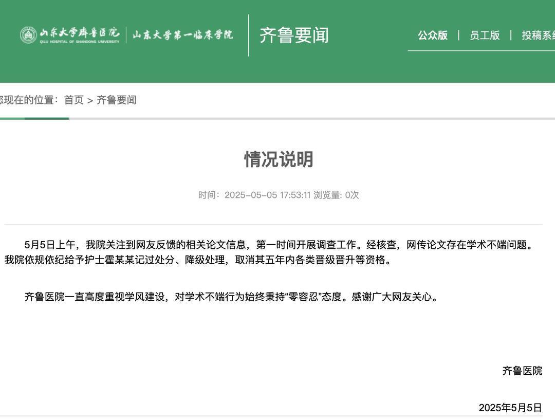 齐鲁医院一直高度重视学风建设,对学术不端行为始终秉持“零容忍”态度。感谢广大网友关心。